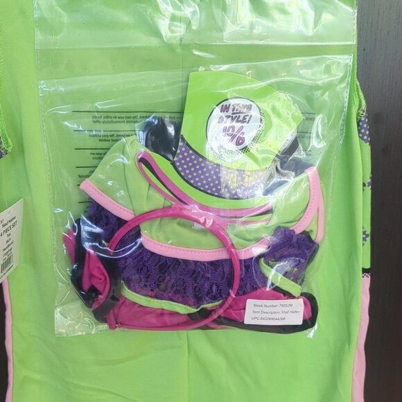 Vibrant Mad Hatter costume for girls. Features a colorful design with green and pink accents. Includes top, skirt, and accessories.