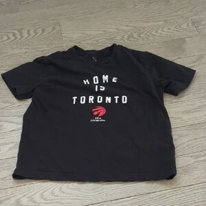 Black t-shirt with 'Home is Toronto' and 'Champions' graphics. Features red and white accents.