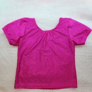 Handmade Girls Pink Short Sleeve Shirt with a scale pattern. Excellent like new condition. Size 4-5 Girls. 13 inches pit to pit aprox, and 15.5 inches shoulder to waist aprox. Fabric has a nice shimmer and stretch to it, but fabric unknown.