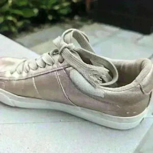 Girls Ralph Lauren size 4 leather (age 7-8) sneaker in Mettalic. The upper material of shoe is a metallic finish and features the iconic Polo Pony logo. Sneaker includes flat lacing, rubber outsole, and padded insole for boosted comfort.