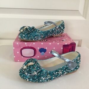 Brand new girl’s size 35 (Big Kid US 2M) princess Mary Jane shoes. Glitter design with bow rhinestones and pearl. 1.2 CM Low Heel design,Non skid and durable rubber sole,Convenient velcro closure. Perfect to feel like a princess.