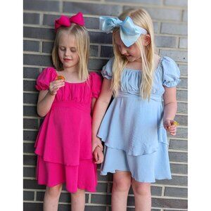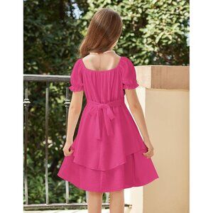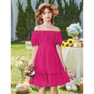 🆕Girls Rose Red Polyester Off Shoulder Puff Sleeve Ruffle Tiered Layer Party