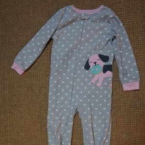 Girls Size 5T Carter's grey/pink/white polka dot 1-piece flannel PJs with pink/grey puppy on front. Non-slip enclosed feet. Zipper opening.