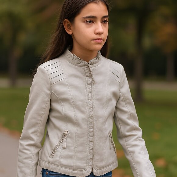 .This is a JouJou girls' cream faux leather jacket, specifically designed for younger girls.