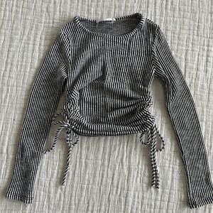 Girls stripped shirt, black and white. Tie sides or wear full length - comfortable both ways. Brand caution to the wind. Size 6