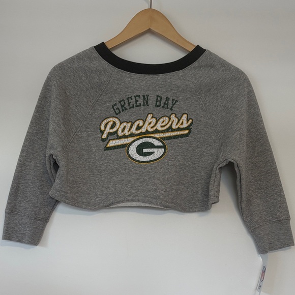 Official Green Bay Packers logo on a grey cropped sweatshirt. Crew neckline with black trim. Soft heather grey fabric with green and gold team detailing. Brand new with tags.