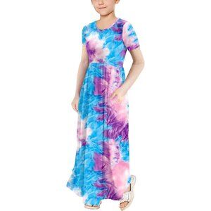 🆕Girls Tie Dye Dress Kids Short Sleeve Casual Loose Fit Maxi with Pockets