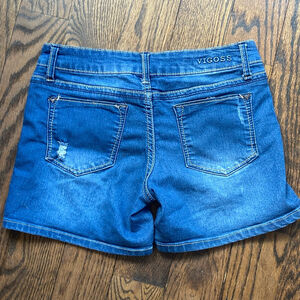 These are pre-owned Vigoss "The Jagger" denim shorts, size 14. The material is 60% cotton, 25% polyester, 13% rayon, and 2% spandex. They feature a standard button closure, front and back pockets, and belt loops. The shorts have decorative patches on the front and intentional distressing. There is some wear and tear on the patches, with loose threads and frayed edges.