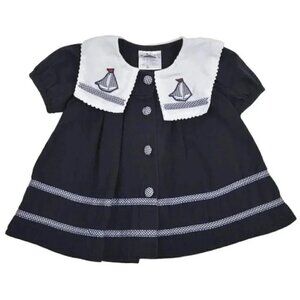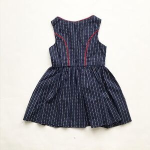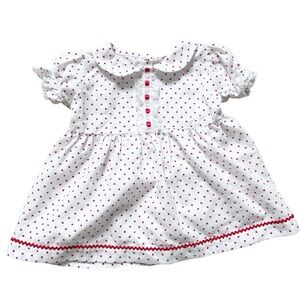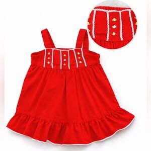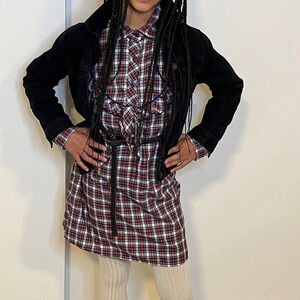 The dress is made of a soft, fleecy medium weight cotton-poly blend fabric in a red, white, and navy plaid pattern. It has a button-up front and a tie.