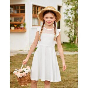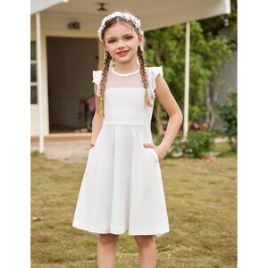 🆕Girls White Polyester Summer Ruffle Sleeve Mesh A Line Casual Party Dress