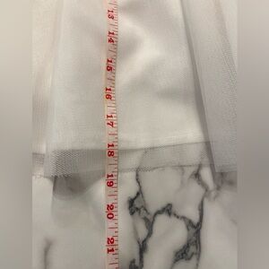 The upper body is lace or lace like with a cap sleeve and a zipper and button at the back. The skirt is four layers. Two that Tulle and the other two are a slip like material. There is a rosette on the midsection in the front of the dress.. There’s also a velvet like piece of material that goes around the front half of the dress, that acts like a belt it has a shimmer to it. As it goes to the back area, it turns into a shear like fabric that you can then tie in a bow in the back of the dress.