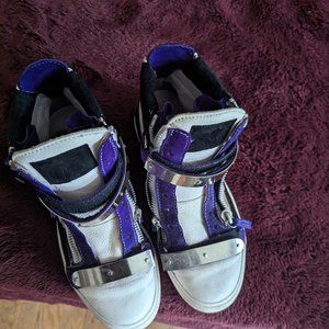 Size 7 US (37 1/2 EURO) Guiseppi Zanotti, high-top leather Sneakers. Made in italy. Black, purple, white, red. A couple of marks on them, as pictured. the shoe and sole are in excellent condition, though they have been worn. Slight scuffs of heels. No box, needs laces.