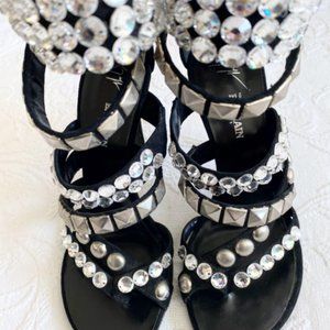 Giuseppe Zanotti x Balmain Black Suede Rhinestone Evening Sandals Heels