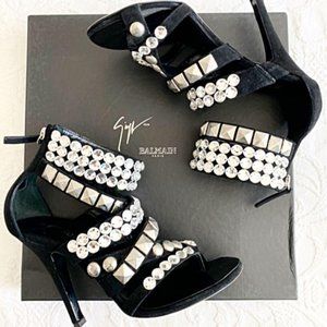 Giuseppe Zanotti x Balmain Black Suede Rhinestone Evening Sandals Heels in Box
