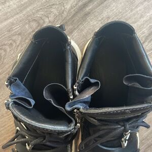 Giuseppe Zanotti high-top sneaker features matte leather with gleaming hardware. Multiple straps and zippers complete the road-ready effect.