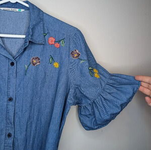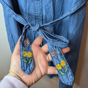 Given Kale Denim Button Down Floral Embordered Tie Waist Dress Women Medium