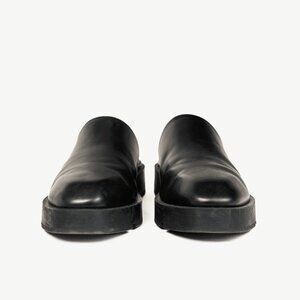 These backless loafers from Givenchy are crafted in a smooth Black calf leather, and feature flat stacked block heels, closed rounded square toes, and chunky rubber outsoles.