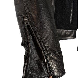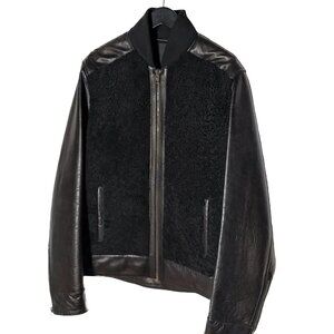 Dark brown lambskin with a black shearling panel design. Ribbed stand collar, zip closure at the front, leather-trimmed pockets, and zippered cuffs for a tailored finish. Interior showcases smooth leather details and the Givenchy logo patch, while the ribbed hem adds a structured silhouette. Made in Turkey.
