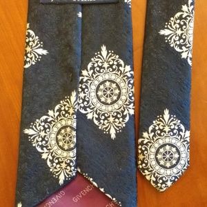 This Givenchy dark blue neck tie with white Art Nouveau-style geometric patterns is in very nice condition, free of any rips, stains, tears or pulled threads. This stylish necktie is 100% silk.