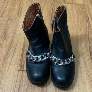 In good worn condition. The soles show signs of wear. One shoe is missing the insole. The top of zipper closure has a bit of torn off Leather. shown in photos.