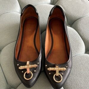 Givenchy black leather pointed toe flats with gold ring buckle embellishment on toe, leather insoles/outsoles.Ring on toe does move/ make a noise when you walk. Made in Italy. Size 40. Very good used condition with some signs of wear, some small marks on gold toe emblem, some light scuffs/scratches to leather, small marks under the ring on toe from movement, not seen unless flipped up. Wear to insoles/outsoles. No box, no dust bags, no cards, no receipts. Please see photos, measurements are for reference only.