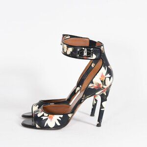 These Givenchy Shark-Lock sandals feature a striking magnolia and moth print on black leather, paired with the brand's signature silver-tone shark-lock closure. Crafted in Italy, these heels showcase a chic open-toe design and an adjustable ankle strap for a secure fit. While there are visible signs of wear on the soles and minor scuffing on the leather, the sandals remain in good overall condition and are ready to elevate your wardrobe.