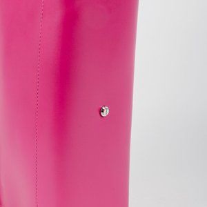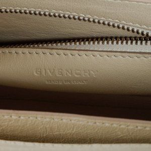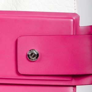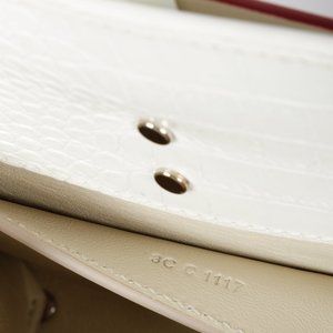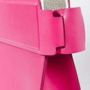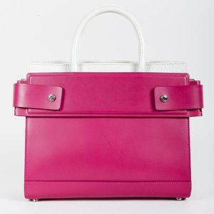 Ricardo Tisci for Givenchy’s Horizon satchel in bright fuchsia pink with contrasting white croc-embossed top handles and detachable crossbody strap. A structured tote bag, the Horizon bag has a minimalist design with bold right angles, featuring a banded top and an ecru leather-lined interior with two slip pockets and a single zip pocket.