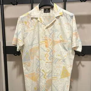 Casual button-down shirt with abstract design. Features short sleeves and a relaxed fit.