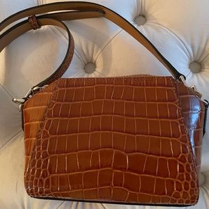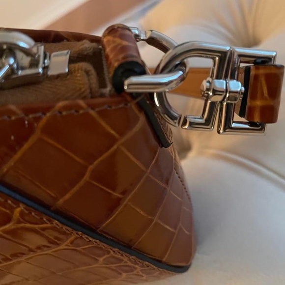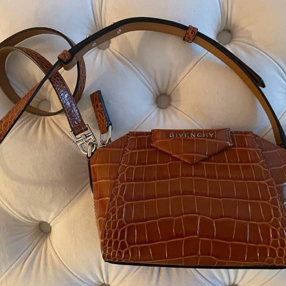 Givenchy Nano Antigona Croc-Embossed, Tan Leather Crossbody Bag. Please note: Strap is permanently attached. Nordstrom fixed it, to ensure it is securely attached. Message me for details. Width: 8.5" Height: 5" Depth: 3". Strap is adjustable. Zipper closure. Main compartment is fitted with pocket for business cards. Silver hardware. Open to offers.