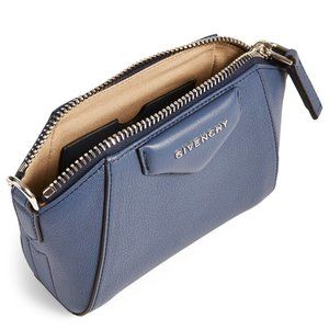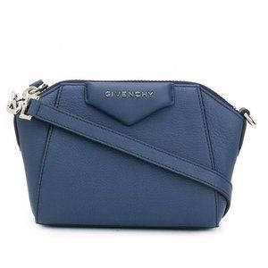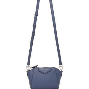 Structured grained goatskin shoulder bag in navy. Burnished edges in black throughout. Adjustable and detachable shoulder strap with post-stud and logo-engraved tab-slot fastening. Logo plaque at face. Leather card slot at interior. Canvas lining in beige. Silver-tone hardware. Approx. 8.5" length x 5" height x 3" width.