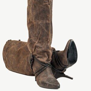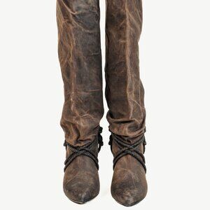 Expertly crafted with taupe grey textured leather with a waxy finish, these Givenchy boots reach knee height for a stylish statement. Featuring a leather rope-drawstring at the top of the shaft and intricate rope detailing around the vamp, these boots have an almond toe and a 4.5" heel for a flattering silhouette.