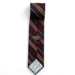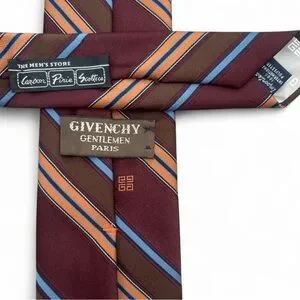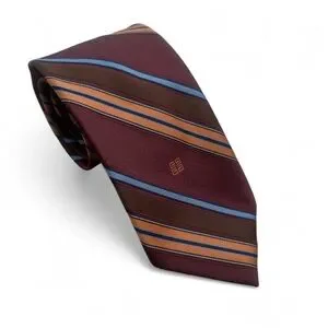 Excellent 10/10 – premium 100% polyester with subtle sheen, deep burgundy base featuring diagonal stripes in brown, blue, orange, embroidered Givenchy logo.