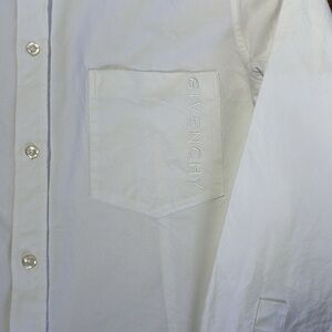 Heavy weight cotton button down shirt with embroidered Givenchy logo. Two tiny marks on the sleeves that are barely noticeable (see photos). In otherwise excellent condition.