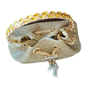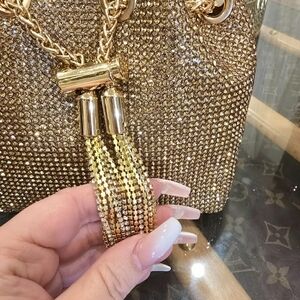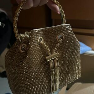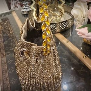 โจ Shine bright at your next event with this stunning Gixugo rhinestone handbag! Brand new with tags, this gold-tone evening bag features a structured bucket shape, shimmering crystals, and a metallic handle โ perfect for weddings, galas, and special occasions.