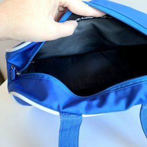 Bright blue washable fabric. 14'' x 9''. One pocket has some white stains on the lining. Overall is good condition. Nylon. 60s.