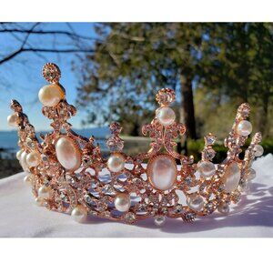 Gladiolus Tiara Rose gold colored tiara with faux pearls and silver rhinestones