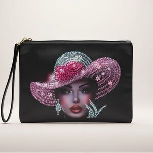 Elevate your everyday essentials with this luxury rhinestone‑embellished cosmetic wristlet, designed for anyone who loves bold beauty and standout style. The front features a stunning illustrated woman adorned in multicolored crystals, creating a dazzling, high‑fashion look that instantly catches the eye.
