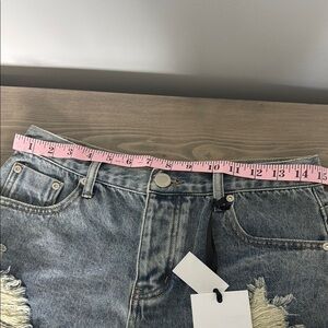 These Glamorous jean shorts feature a heavily distressed design with prominent rips and a raw, frayed hem, offering a trendy, worn-in look. The medium blue wash adds a classic touch, making them perfect for casual outings.