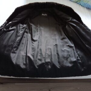 If I didn't already have two fur coats I would be keeping this for myself. This coat belonged to my great aunt and the pictures do not do it justice. I am not a fur expert, but believe that this coat is mink due to it's "wet look" shine, softness, and the size of the pelts. My great-aunt also had to have the best of everything and I imagine that this coat was only worn to church. It features a collar, side pockets, balloon sleeves, padded shoulders, a beautiful large button closure at the top and three hooks that open to close the remainder of the coat. My great-aunt's initials are monogrammed inside the coat. It is lined in black and in beautiful condition with only some wear to the inside of the cuffs and a part of the inside lining has come loose. Please see all photos. From Western Furs, Regina, Saskatchewan, Canada.