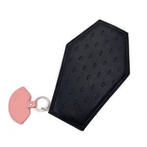Coffin shaped clutch with bat pattern. Has a zipper pull with lips with vampire teeth.