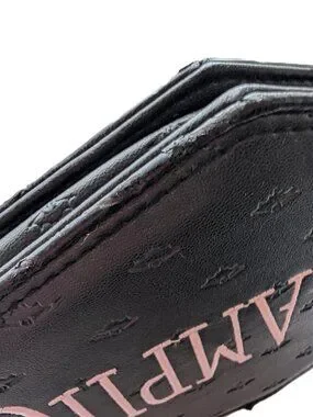 Exterior: Black faux leather (polyurethane) with embossed all-over bat/coffin pattern and embroidered "GLAMPIRE" text in gothic script