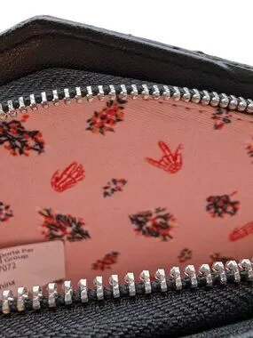 Interior: Blush pink fabric lining with red and black floral and skeleton hand print pattern