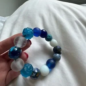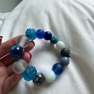 Hand-strung stretch bracelet with mixed glass beads. Features matte, frosted, and marbled round beads. Vibrant ocean-inspired blues and teal accents.