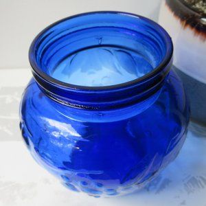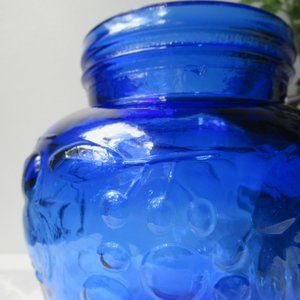Description. Vintage jar in rich cobalt color with a fruit and berry motif.