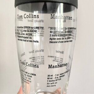 Simple, glass cocktail shaker with 6 drink recipes printed on the glass in French/English!