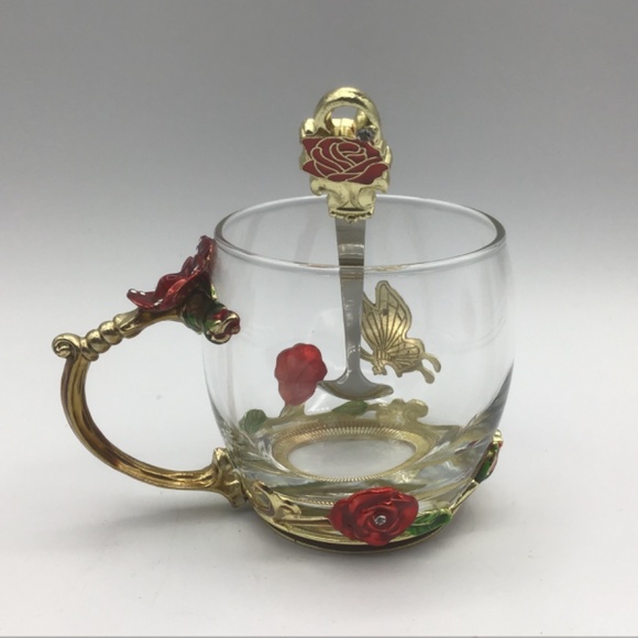 Glass Coffee Mug with Spoon Enamel Butterfly Rose Flower Tea Cup w Decorations.