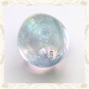 Add a touch of celestial charm to your space with this stunning handblown egg-shaped paperweight from Glass Eye Studio. Crafted in Seattle, this clear glass piece features a mesmerizing opalescent interior that shimmers with iridescent hues. Signed “GES” on the base with the year '96, it’s a collectible work of art that blends elegance with ethereal beauty.