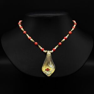 Artisan Glass Lampwork Fish Pendant on Beaded Wire Chain with Lobster Clasp. adorable little red fishy against a sandy gold background under the sea; large pendant at 2" long, such a unique and sweet piece! obviously handcrafted with love, however the crafter and time period is unknown. a cheerful addition to your jewelry box!