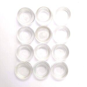 This is a vintage set of 12 furniture coasters, often called "carpet savers," manufactured by Dominion Glass Company in Canada during the mid-20th century.