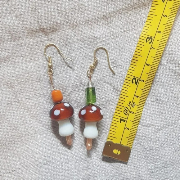 upcycled handmade mixed material earrings. Mushrooms are glass, beads are glass, baroque pink pearls are faux. Earring hooks are nickel free
